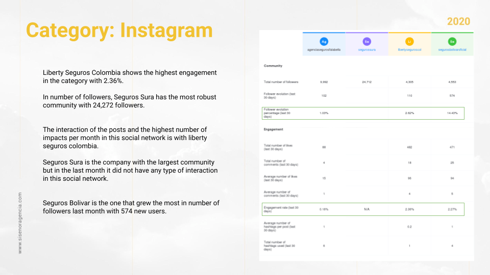 Liberty Seguros Colombia shows the highest engagement in the category with 2.36%.