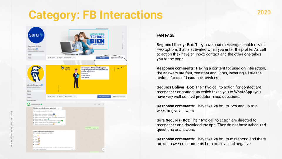 Response comments: Having a content focused on interaction the answers are fast, constant and lights, lowering a little the serious focus of insurance services.