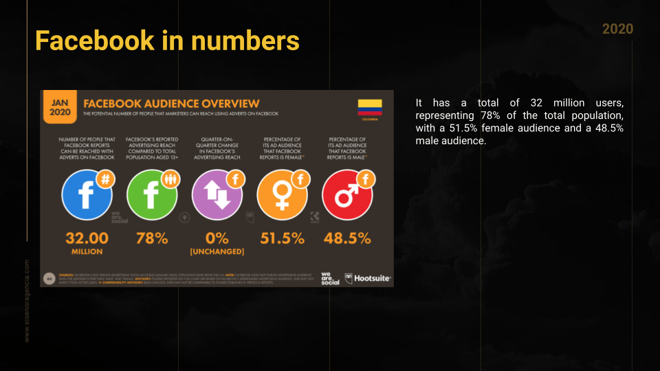It has a total of 32 million users, representing 78% of the total population, with a 51.5% female audience and a 48.5% male audience.