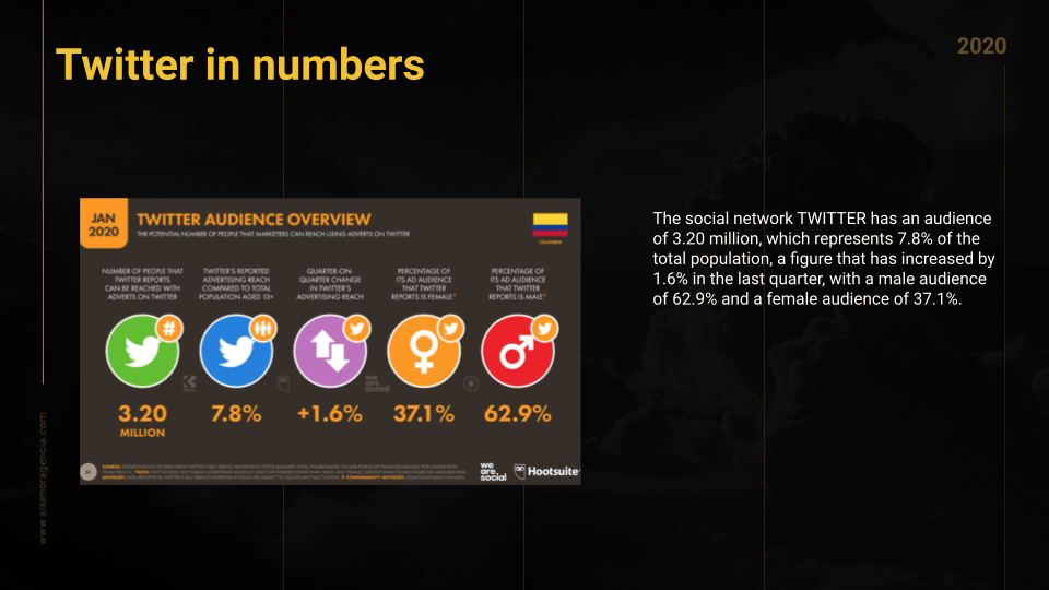 The social network TWITTER has an audience of 3.20 million, which represents 7.8% of the total population, a figure that has increased by 1.6% in the last quarter, with a male audience of 62.9% and a female audience of 37.1%.