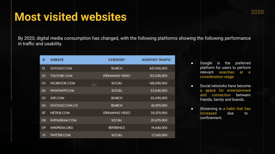 By 2020, digital media consumption has changed, with the following platforms showing the following performance in traffic and usability.