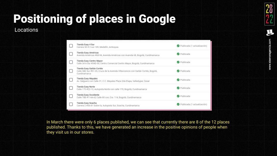 • We have 8 places published on Google, where people can tag us when they visit our stores.