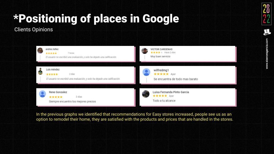 • We identified that recommendations and positive ratings increased in Easy’s places in Google since April.