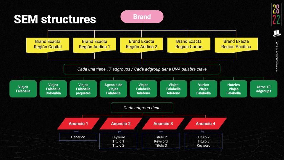 Conduct an analysis of the account structures, media, campaigns, objectives, keywords, dates, among other actors involved in Viajes Falabella’s campaigns.